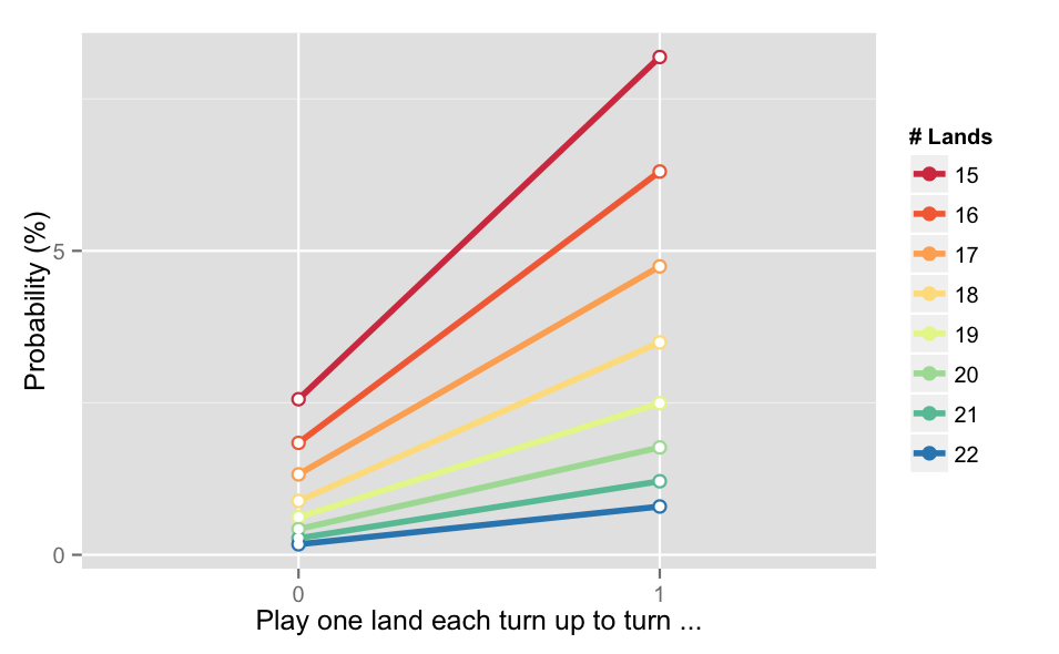 It might seem to be strange that the 15-land deck has a higher probability to play one land compared to the decks with more land, but keep in mind that we are talking about the probability to play one land and then miss the second one!