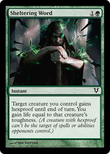 The only reason this card deserves mention is because there is a relatively unknown combo with Nomads en-Kor, Task Force, and Heal the Scars which results in infinite life (or would, if MTGO recognized infinite combos). In this deck, Sheltering Word acts not only as a combo piece, but also does all relevant things at half the cost. The combo is a bit weird on MTGO, since you can not just declare that you wish to gain infinite life and have the opponent scoop, but will more often than not repeat the same action an endless amount of time and just keep F6-ing until the opponent loses (or gets frustrated and quits). But nonetheless, it is a useful card for the archetype.