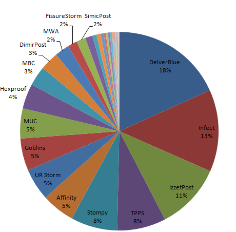 We have seen some significantly dominating performances here in the Competitive Corner. In some cases we’ve even seen a single deck-type account for a quarter of all of the week’s showings. This performance by DelverBlue was not that overpowering; however, DelverBlue players did manage to show up in force, as they easily won more than any other deck with a significant 30-win cushion. Just as surprising was the fact that the number-two deck overall was Infect, knocking down the usual Storm contender. This almost makes me want to examine again the split between TPPS and UR Storm, as the combined total would have been only two wins away from beating out Infect. This is not meant to put down how well Infect performed this week, but instead to examine the difference between the two… oh well… that is probably an entire article within itself… *makes note* Other names remained strong as we see a continued resurgence of Goblins and a significant role of Mono-Blue control variants as they managed a total of 141 showings between the three types, approximately 24% of the total. This means if you’re looking to “sleeve up” for an upcoming Daily Event, you best have your game plan ready for some, if not all, forms of Mono-Blue Control.