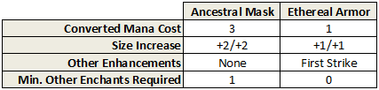 Allow me to quickly clarify that last box there. If we take a look at the wording on Ancestral Mask, it says that it will make the enchanted creature bigger for each other enchantment on the battlefield. Looking at the wording on Ethereal Armor, we see that it makes creatures bigger for each enchantment. What this means is that when you put down an Ethereal Armor on a 1/1 creature where that is your only enchantment, the creature becomes a 2/2. If you have an Ancestral Mask with no other enchantments, then that creature remains a 1/1. These two enchantments really don’t compare. In the late game, when you have more enchantments on the field, Ancestral Mask becomes a powerhouse, but in the early game you can’t compete with the ability of Ethereal Armor.