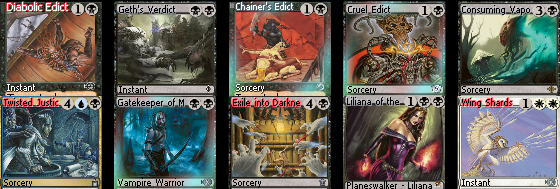 Yep, if you look closely, you’ll see that most of these don’t fall within the boundaries of Pauper’s commons only rule. Out of these ten cards, we have only two playable options with Diabolic Edict and Geth’s Verdict (unplayable would include Grave Exchange). Even then, this list is somewhat jaded towards running heavy black in your deck because of the fact that Geth’s Verdict requires double black mana to play.