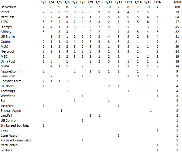 I do think that it is perhaps time to revisit my old rule where I limited the decks that made it onto this table. Before it was ruled that only one Daily Event per format, per day, would be posted, I had a limit in place for decks. I had it laid out so that any decks that did not show up more than five times within a week would be left off and simply deemed as the week’s rogues. This was altered based on the fact that there were so fewer decks listed out thanks to the new, censored data. The thinking was that there would not be so many different variations on deck types showing up on a weekly basis and this table would not get out of hand. Well, maybe this is simply a result of the madness caused by Force of Will. I think for now, I’ll give it a bit more time just to see if things settle out a little bit, but I will keep in mind that this chart is getting a bit ridiculous in length.