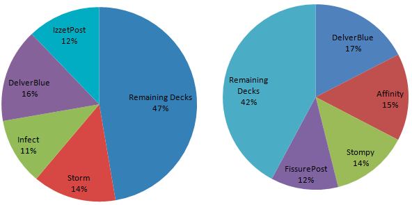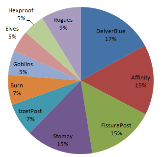 Things were still pretty close at the top. DelverBlue took first place handily with a five point lead, but right behind it was Affinity and FissurePost/Stompy (tied for third). I still find it interesting how much things drop off from this point. Between third and fourth place, there is a difference of 24 showings. I guess this best illustrates the different tiers because after the showing of 15 by Hexproof, things drop significantly once again, this time by 10 showings, to form the third tier. Things remained mostly the same from last week as the middle ground is still made up by the likes of IzzetPost, Goblins, Burn, and Elves (in almost that exact order).