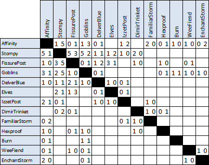 If you saw the one from last time around, you’ll notice some small changes. I have obviously gone through and removed the Storm decks that have now been banned into the void as well as reset the numbers for Infect because it’s illogical to compare the Infect of today with the pre-ban Infect. If you haven’t checked out the match table before, you’ll see there are two tabs with the second being the legend. If I took the space to write out all the labels, you’d have to scroll so much to see things, that hopefully this helps. This time around I’ve also color-coded things based upon their match, ranking from unfavorable to favorable. As always, I caution everyone to take these in stride and consider that some small data skew things. For example, if you see the match of DelverBlue vs. Infect you’ll see that DelverBlue is 1-0 in that match and it’s listed as a favorable match. While a no-loss showing is a favorable thing, there is only the datum of a single match to go off of and there could be other determining factors that could alter that. A more reliable match would be DelverBlue vs. IzzetPost, where DelverBlue is 10-10. With more data to pull from, it is safer to assume that the match is really close to 50/50.