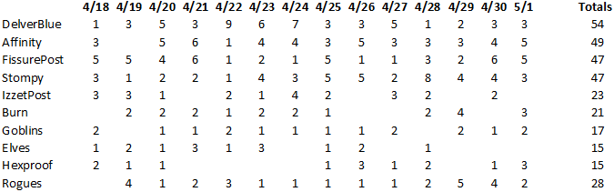This information includes all the non-rogue results we’ve had over the last five articles. What’s represented here and not labeled includes decks that accounted for approximately 1% or less of the meta. I also decided that this time around I’d include a running total on rogues just to give a general idea not only of what percentage of the metagame rogue decks account for, but to also provide a true picture of the deck totals. While the top four remain a majority of the total metagame, it’s important to note that the real drop-off point from tier 1 decks falls after that fifth deck, IzzetPost. The difference between IzzetPost at number 5 and Goblins at number 6 is a total of 132 showings.