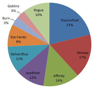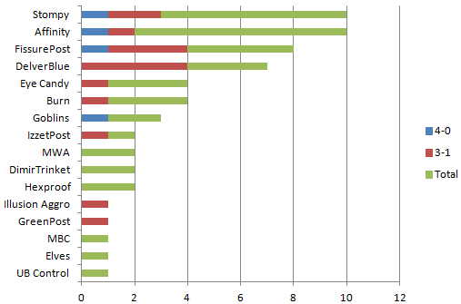 There were a small number of undefeated showings this week, but a decent number of overall showings. Only four players managed to reach that 4-0 mark with no specific front runner. These decks included Stompy, Affinity, FissurePost, and Goblins. Beyond that there were fifteen decks ending up at a 3-1 record for a total of 134 packs won in this event.