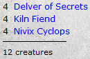 Now consider for a minute the deck’s biggest nemesis, black-based control, which easily runs up to 13 creature kill spells, not to mention the use of a couple of Crypt Rats. Add to that the different ways that black-based control decks have to manipulate their opponents’ hands as well. Things like Ravenous Rats, Chittering Rats, Duress, Augur of Skulls, and so on, all can remove instants and sorceries from their opponent’s grip, which makes it harder for them to combo out for fatal damage in one swing. Consider another popular tier 1 deck for this match in DelverBlue. While DelverBlue does not have a lot of opportunity to interact with the creatures once they hit the table, they do have the ability to counter a Nivix Cyclops before it hits the table, which allows it to avoid the Apostle’s Blessings and decreases the pieces from 12 to 8, and we all know how easy DelverBlue can find eight Counterspells. Anyone playing against Eye Candy knows that they simply have to take out the Kiln Fiends and Nivix Cyclops to really gimp the deck. Granted, a flipped Delver of Secrets can win a game, but it doesn’t have the same firepower and is easier to shut down.