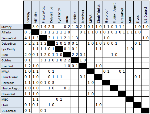 There were 59 players who showed up for this event. Among these 59 players there were 16 different deck types represented with the most prevalent being a tie between Stompy and Affinity. Here’s the full breakdown…