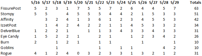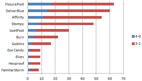 Things are continuing to settle out from our large start, and with the double first-place weeks in FissurePost’s pocket, it finally jumped ahead of DelverBlue in both overall showings and undefeated showings. This week’s casualty was MBC, which fell off the list by only one. This in turn made way for Eye Candy who was able to make it onto the list after only two weeks. FissurePost remains the best option for undefeated showings, but there is an interesting note in that FamiliarStorm has gone undefeated in 25% of its showings. The deck hasn’t been played that much, but when it does it appears to have a high chance of showing and going undefeated. It’s been a bit slow, but I still have hopes for MBC to jump back in and DimirTrinket to step up, as we’ve started to see an increase in the number of non-DelverBlue control decks in the past two weeks.