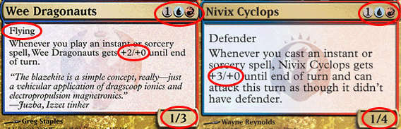 Now there are a few variations that, as I referred to earlier, decide to bring in a copy of Wee Dragonauts still. In most cases this is a +1 creature for a -1 instant/sorcery, so the deck’s core remains the same. As always there are other variations, but these are the most popular build types. Now, that aside, when we take a look at these two different decks, you may notice a few things. First off, the counts are still the same; they did simply replace Wee Dragonauts with Nivix Cyclops and keep the land and instant/sorcery count the same. That aside, the people running the deck have learned a few things, which is good and I’ll get into some of those thoughts in a second, but first there is one very important thing I want you to notice about these two decks: The only new card added to the deck with the printing of Dragon’s Maze has been Nivix Cyclops. What that is implying is that this one card is SO MUCH more powerful than Wee Dragonauts that it propelled the deck from fringe to a regular non-rogue. When we look at these two creatures, it would seem to me that this would be an exaggeration of Nivix Cyclops’ power.