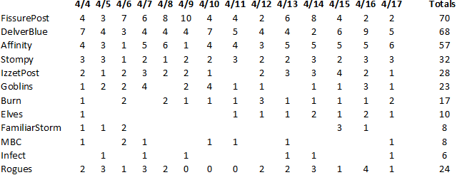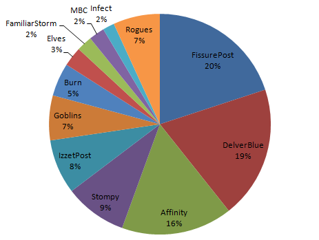 Yes, that’s correct, we’re entering into our first week with FissurePost being the top deck. Now keep in mind this is a grouping of the three different versions that we’re currently seeing, which includes the traditional Simic, a Mono-Blue, and the newest member of the family is a UW variant. I still feel no need to break this down individually, as the approach is the same, and attacking them is done in the same way. They are simply going about it in different ways. As you’ll see, however, (for better or worse) DelverBlue was right behind it, only missing out on first by two showings. This can be mostly attributed to the fact that DelverBlue has considerably good matches against all of the most heavily played decks including FissurePost. With Affinity rounding out the top three, we see for the first time a top three that makes up over half the decks in the metagame. Some old favorites such as Stompy and IzzetPost are starting to fall a bit from favor as they struggle a little in this new meta. I think that IzzetPost is the biggest struggle because it will find it hard to compete against a Fissure-heavy metagame. Beyond those top decks, we’re still seeing the new 12-creature Burn deck making a decent showing and rounding things out with some classics such as Goblins, Elves, and Mono-Black Control. The biggest surprise of the week would be the fact that Infect managed to sneak in past our rogue mark with perhaps the highest showing it’s had since the ban.