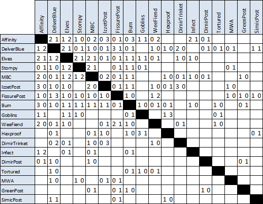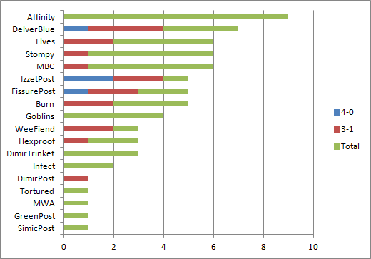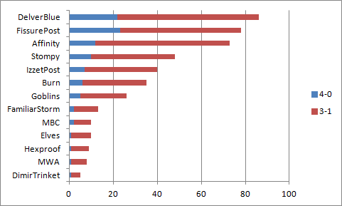 Small changes this week, though we’ll be more likely to see changes in these first few weeks as we start working with a larger pool of data. DelverBlue still remains the most likely to end in the money, but FissurePost has jumped ahead for the most undefeated showings. Its increase in play has also resulted in it moving up ahead of Affinity for the number two spot. Further down the list, IzzetPost moves up a spot after Burn cooled off a bit, Hexproof dropped two spots, and we’ve reached the point where DimirTrinket has finally shown up enough to make our list.