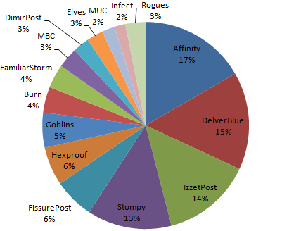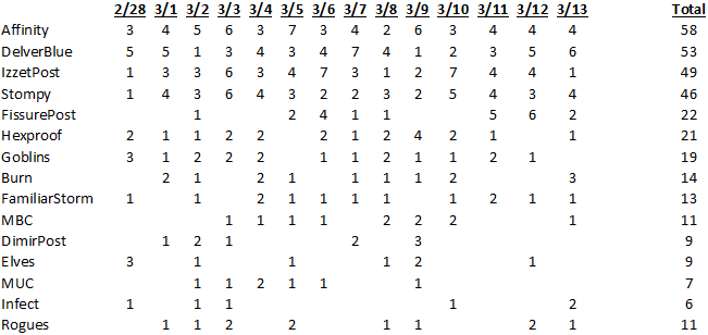 In kind of an interesting move we had Affinity come out swinging to the point where it managed to basically switch places with last week’s number on contender, Stompy. This doesn’t come to me as a big surprise because if you were watching the Daily Events at the end of last week we were already starting to see a large increase in Affinity’s play. The deck can work out at great speed and manages to hold its own easily against a deck like Fissure, which will bounce permanents. An interesting note about Affinity here is that most lists are starting to lean towards the Fling versions whereas in the previous meta we were seeing a large variety of Affinity decks being successful. The addition of Fling gives the deck a lot of power when it can sack off the entire board to Atog for half the damage and then throw it in your face for the remainder. Our big four remains the same with only that change in order, but things of course get a little closer once you move down the list a bit. The drop off beyond the top four is about half and that fifth place belongs to FissurePost. This week there were five out of the 22 showings that were the monoblue version, but the deck has gotten quite a bit of hype recently. With many writers talking about the power of the deck it may have worked to get people on the bandwagon. At the bottom of the list we even had a decent showing from Infect despite the decrease in power level.  Here’s a look at this week’s rogue decks…