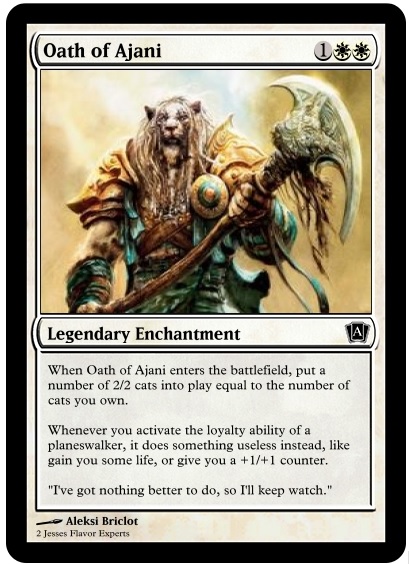 After being discarded by the Wizards of the Coast creative department at a dubious animal shelter, Ajani decided to strike out on his own and find like-minded planeswalkers to adventure with. Ajani’s main technique is writing strongly worded letters to local governments advocating for animal rights, but he also occasionally organizes protests and e-petitions. He is followed everywhere by an entourage of stray cats.