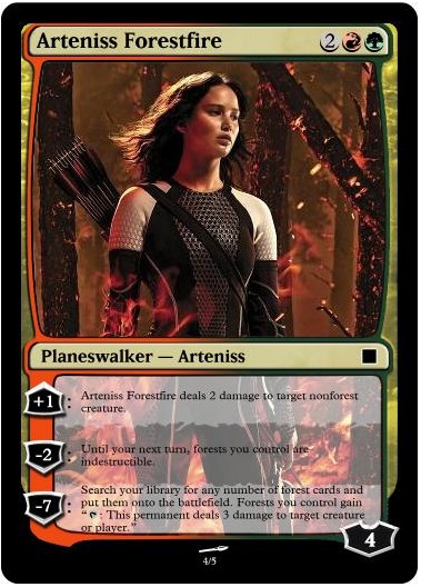 Raised by trees, Arteniss Forestfire loves forests as much as she hates the fire that destroyed her childhood home. In an ironic twist of fate, she was gifted with the power to create and control fire: A power she vows to use only to protect her wooden cousins. When the trees of Zendikar come under threat from the Eldrazi, Arteniss makes sure the Concern-Trollers are first on the scene.