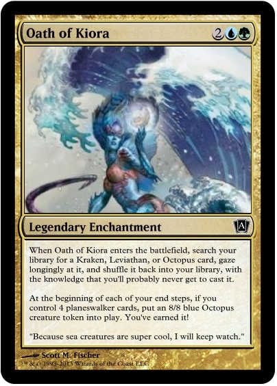 With the Eldrazi on Zendikar, mostly, sorta vanquished, Kiora is free to return to her real passion, searching the multi-verse for adventure and giant sea monsters. Once the other team members agreed to her signing contract stipulation that at least one third of all world-saving missions involve octopi, she became a card-carrying member of the Unusual Animal Friends. Her most common contribution to the team is trying to show everyone that one episode of Planet Earth about the deep ocean over and over again.