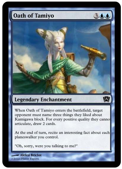 Jesse K: Wow, those were Intellectual-prope-terrific! If anything, seeing this whole spate of new planeswalkers makes me even more excited to see what happens with MCU (Magic Combined Universe) next. Will we see a team of badguy planeswalkers rise to challenge The Gatewatch? Will they add a new member every set to spice things up? Or maybe a West Coast Gatewatch. Only the Wizards creative department knows, so god help us all.