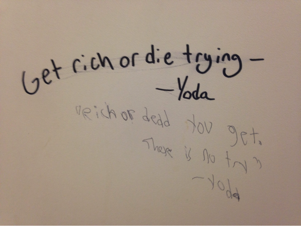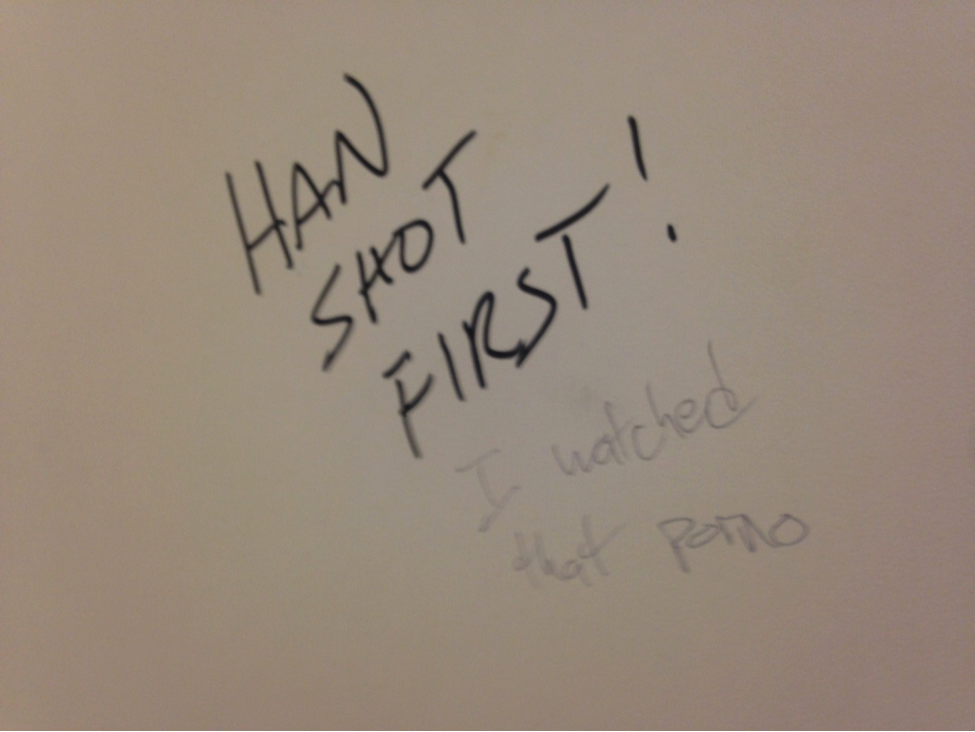 I think what I’ll take away from GenCon is the experience of being surrounded by people with nerdy interests in a context where you don’t have to hide that. Other than Vin Diesel, how many successful people do you know who play Dungeons & Dragons? Probably a lot, actually, but they sure as hell don’t say so out loud. I wouldn’t ever talk to a person on the street about Magic or Doctor Who or the minutiae of Star Wars, and if somebody started talking to me about those things I’d be embarrassed to have that conversation in front of “normals”. One of my other lawyer pals plays MTG and if we talk cards at the courthouse I’m always a bit afraid of what people might think who are overhearing us. At GenCon, you can let loose and be as geeky as you want, because everybody there was at least a little bit geeky. Even the bathroom graffiti was geeky: