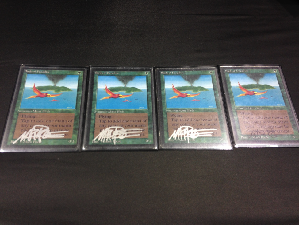 I asked about the ink pen signature, and finally got the scoop on this. He told me that during the first couple of years, if he was asked to sign a card, he used pen because that’s how he would have signed any of his other artwork. The preference for markers had not yet been established at that point. During the game’s first few months in 1993, Mark signed cards the same way his signature appears in the art, with simply the last name “Poole”. He dated the ink pen signature you see on the rightmost card above, which uses his full name, to 1994. Aesthetically I prefer the silver marker, but now that I know the ink pen signature is 21 years old, I have a bit more reverence for the history of it and for Mark’s early involvement with the community. Mark Poole’s is one of the most common signatures, and indeed I would not be surprised if as much as a quarter of the rarest cards containing his art were signed, but that simply speaks to how accessible he has been to the players and collectors through the years. It was truly an honor to meet one of the original MTG artists and to own this sweet set of Birds to play in all of the Tier 3 Modern decks I build.