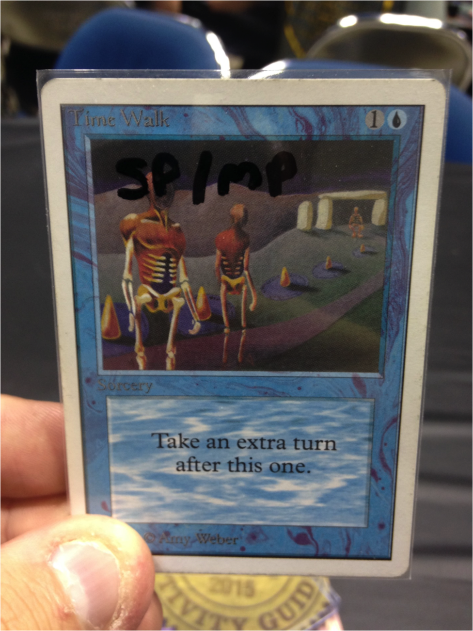 Wandering back to the vendor tables, I decided it was time to unload some of the Modern stuff I wasn’t playing and pick up a new piece of Power! This required shopping around a bit for the best buylist prices and for the best prices on Power 9. Pro tip for vendors selling Power 9: your consumers know a lot about high-end cards, so you should know your inventory very well. I found a reasonably priced Time Walk, but upon examining it, I found it had been inked on the backside to hide border-whitening. I inquired of the vendor, and he seemed surprised to learn this. An inked card absolutely MUST be disclosed as inked, any eBay seller would certainly disclose it, and I had zero confidence in this guy’s inventory as a result. I eventually found a seller that had a nice Time Walk with an SP front and MP back, and a good buylist price on Snapcaster Mages, and picked up this baby: