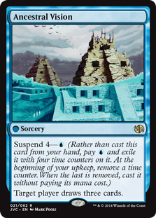 The first thing I did upon hearing the news that Ancestral Vision had been unbanned was go digging through my paper binder to see if I’d kept my Jace vs Chandra duel deck copies. Alas, I had not. Thankfully, I did keep my playset on Magic Online, as the card quickly spiked to over 20 tickets apiece before settling back down in the 12-13 range as of this weekend.
