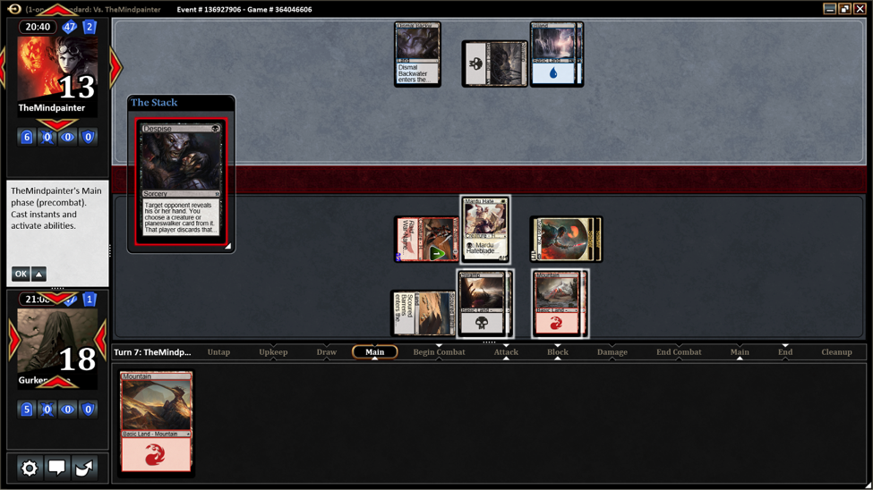 That’s something to remember. Especially newer players tend to empty their hand for no reason. The Mountain wouldn’t do me any good on the board. But a card in my hand could be everything and your opponent has to play differently than if you have no cards in hand. So keep lands in hand when they are useless on the board. In this case Despise couldn’t let me discard a card but it let her play Illusory Angel.