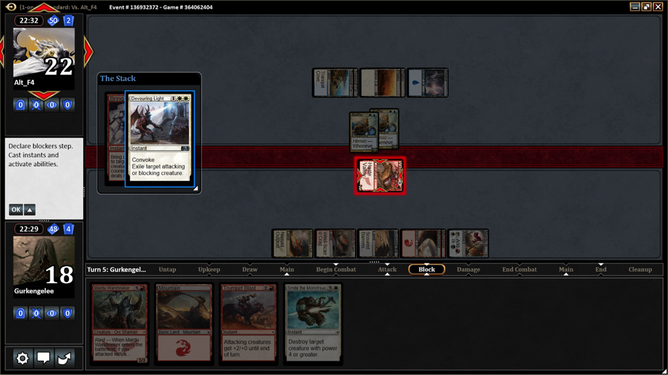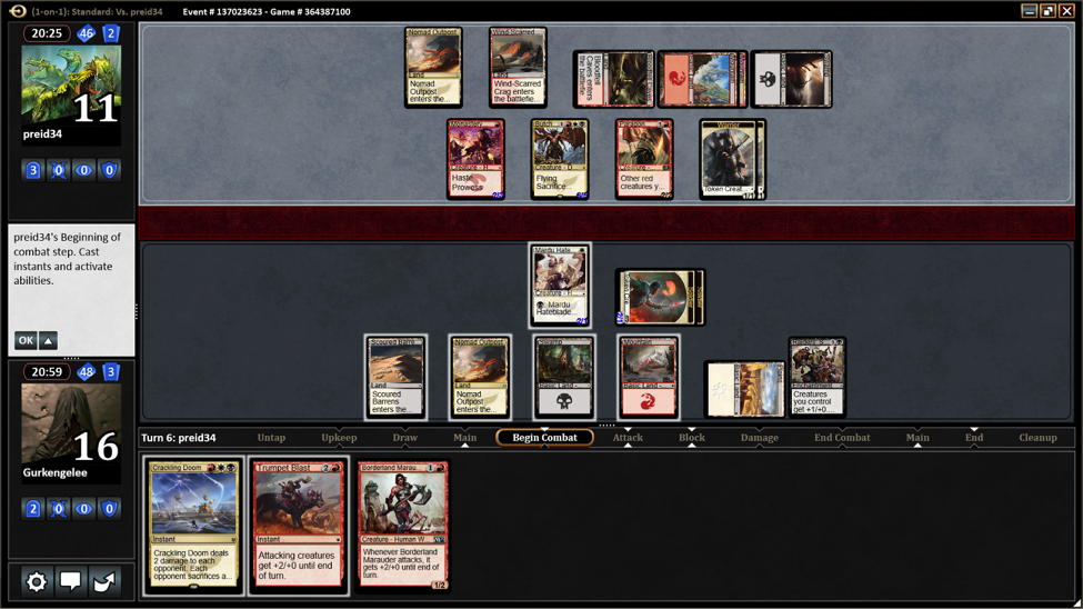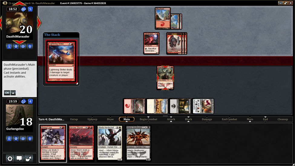 She played Generator Servant and Hordeling Outburst. I didn’t play anything until Turn 4 when I could play Mardu Warshrieker. It was instantly killed by a Lightning Strike.