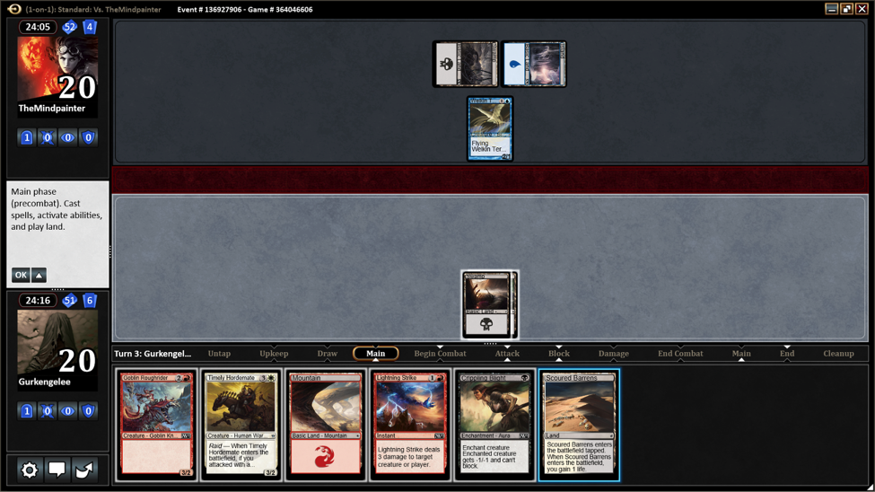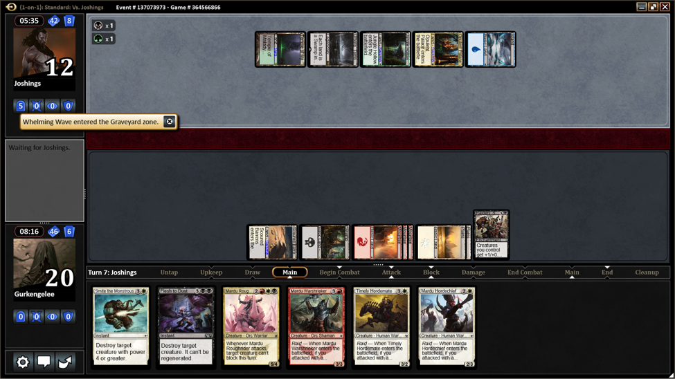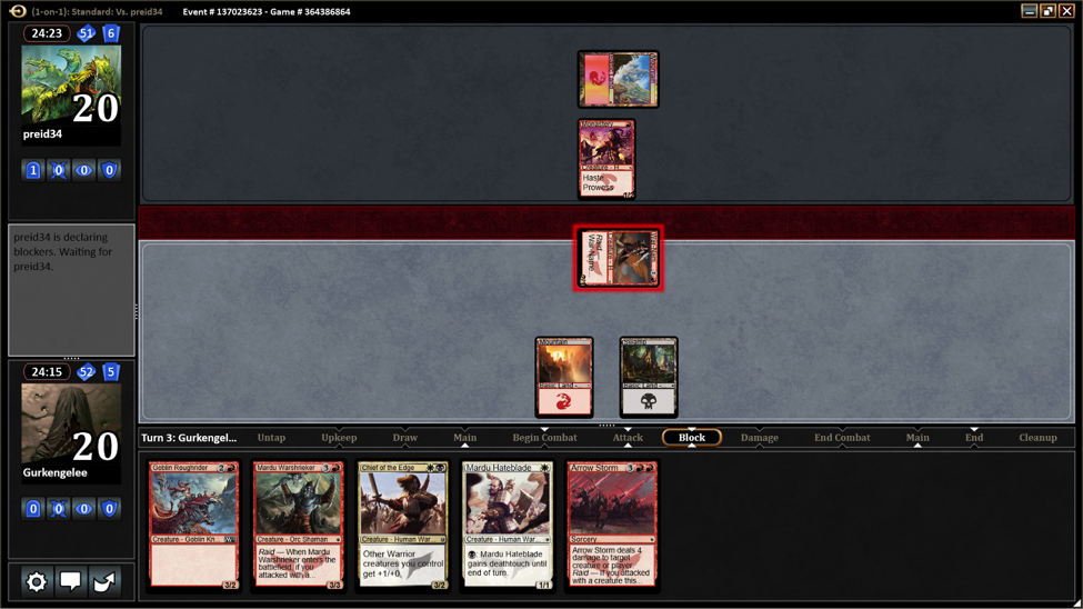 I didn’t draw a source of red mana, she didn’t draw anything to cast. So we just played lands until Turn 3 when I played Mardu Hordechief and she played Goblinslide.