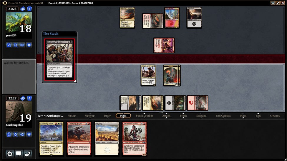 In Game 2 we both got enough mana to play something. I had Chief of the Edge, she had Monastery Swiftspear. I attacked and supplemented my troops with Raise the Alarm. Those tokens are sadly no warriors. I then drew Raiders’ Spoils and was very excited to try it out.