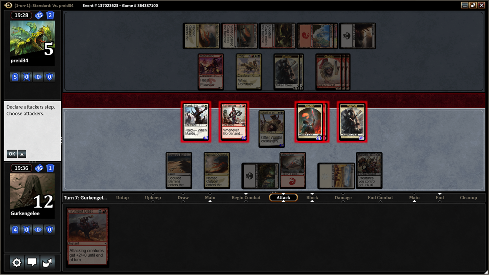 I drew Chief of the Edge and played it. Even with trumpet blast there was no way to kill her now since she could simply block every creature of mine. But since our deck doesn’t include any mass removal I decided to attack nevertheless to clean up the board a bit. And lo and behold she blocked everything but the single warrior token. The token was 3/1 due to Raiders’ Spoils and Chief of the Edge. She was on five life points. I had Trumpet Blast.