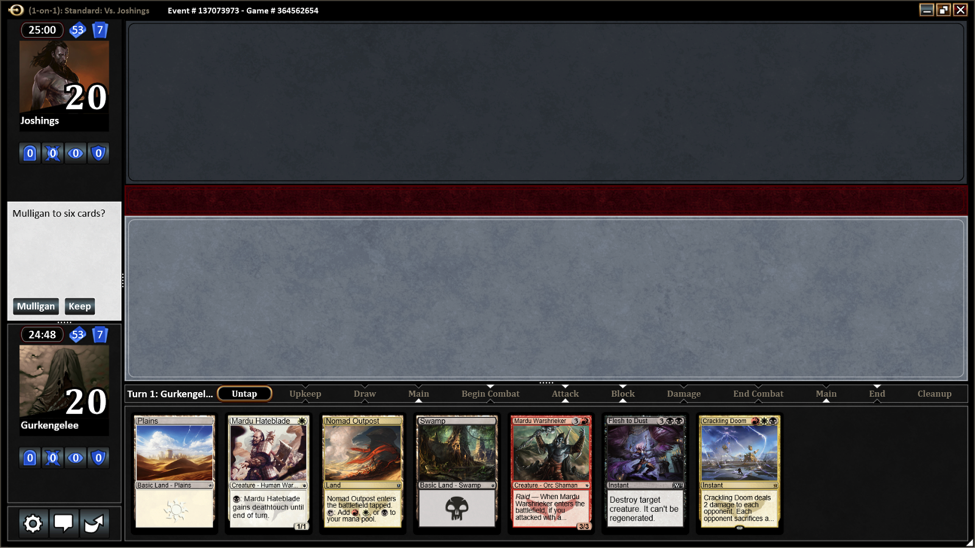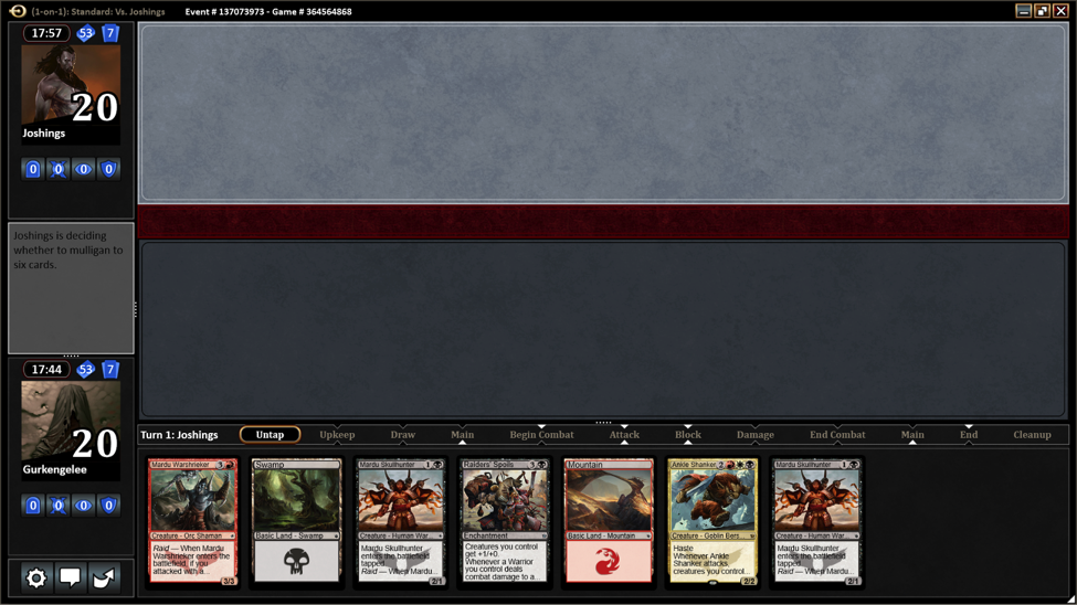The first match was against another W/R/B deck, which was more sophisticated that the pile of cards I had. I had zero lands on my first hand and then mulliganned to this: