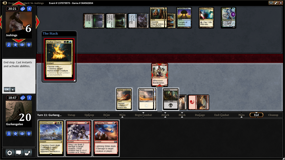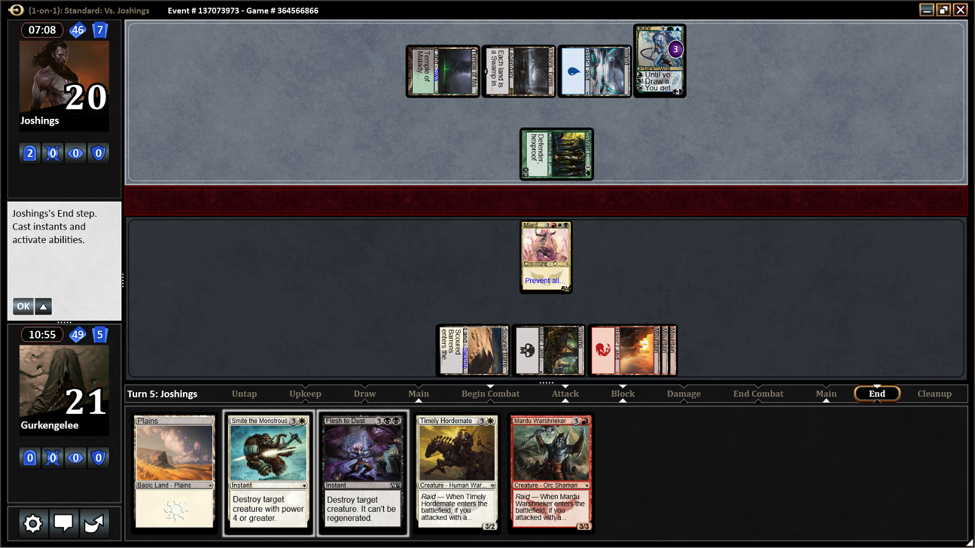 The last match was very exciting and showed the strengths and weaknesses of our deck. I started out with a hand that could play something and had every color of mana.