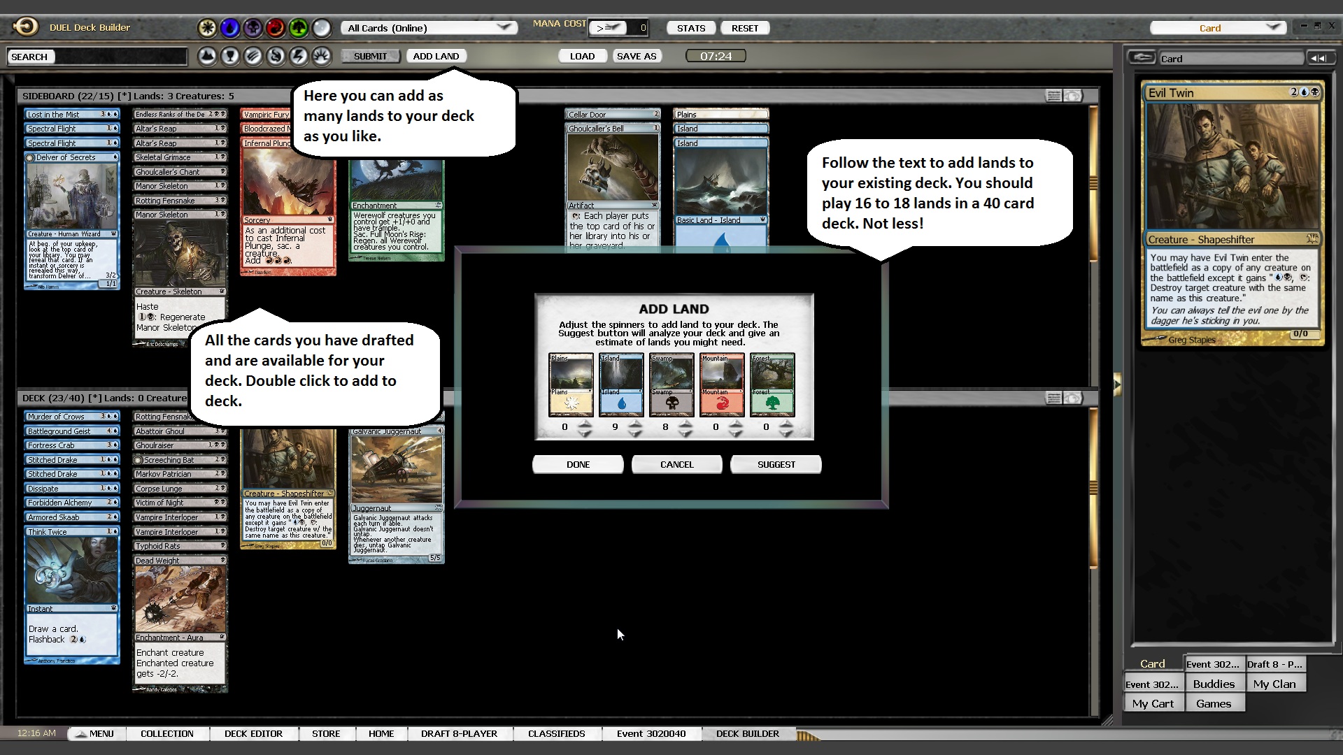 Once you have picked 45 cards and all the other players have done the same, the screen view will switch to the deck building screen. Here you can use the cards you have drafted to build a 40 card deck you will use to play out the matches versus the other players. All cards that do not end up in your deck build your sideboard and can later be used to make changes between games.