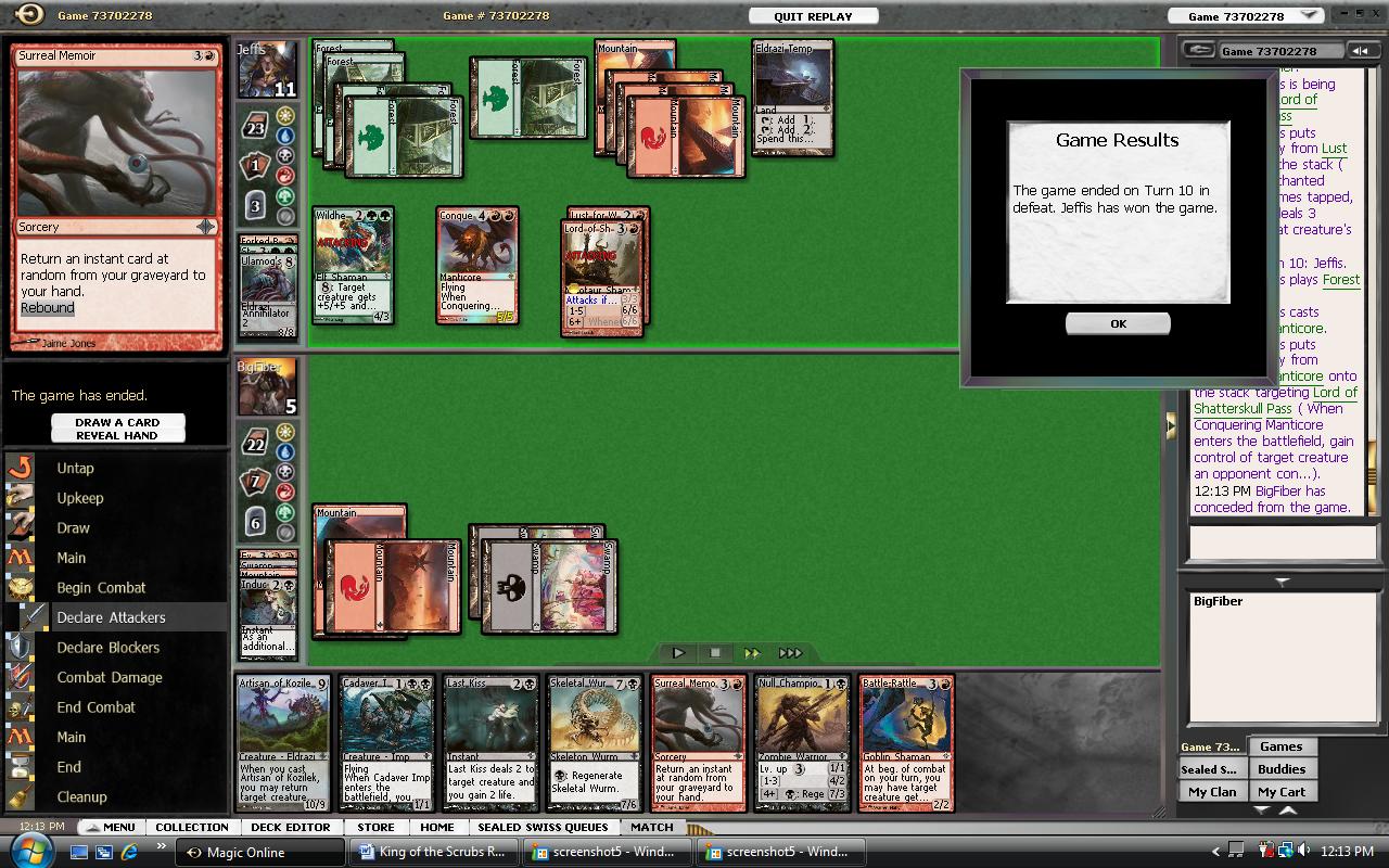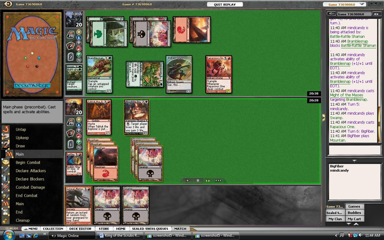 If you look closely you’ll see I drew 5 lands in 6 turns. It’s how I roll. Sigh. My opponent also used Might of the Masses again to wreck me by pumping his Bramblesnap and blocking my 4/2 attacking Battle-Rattle. It was like salt in the wound.