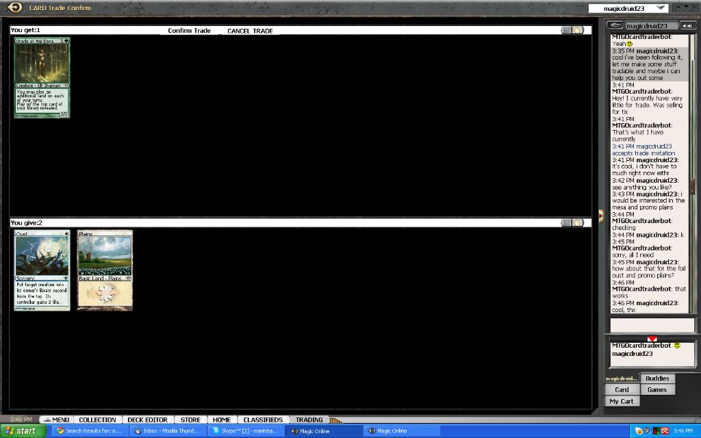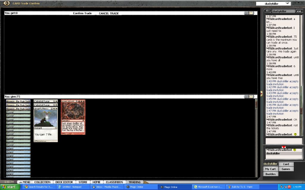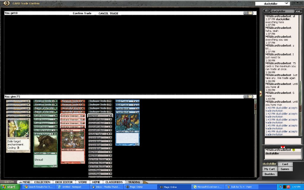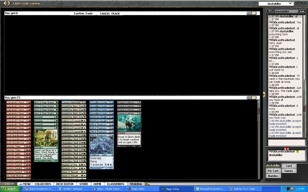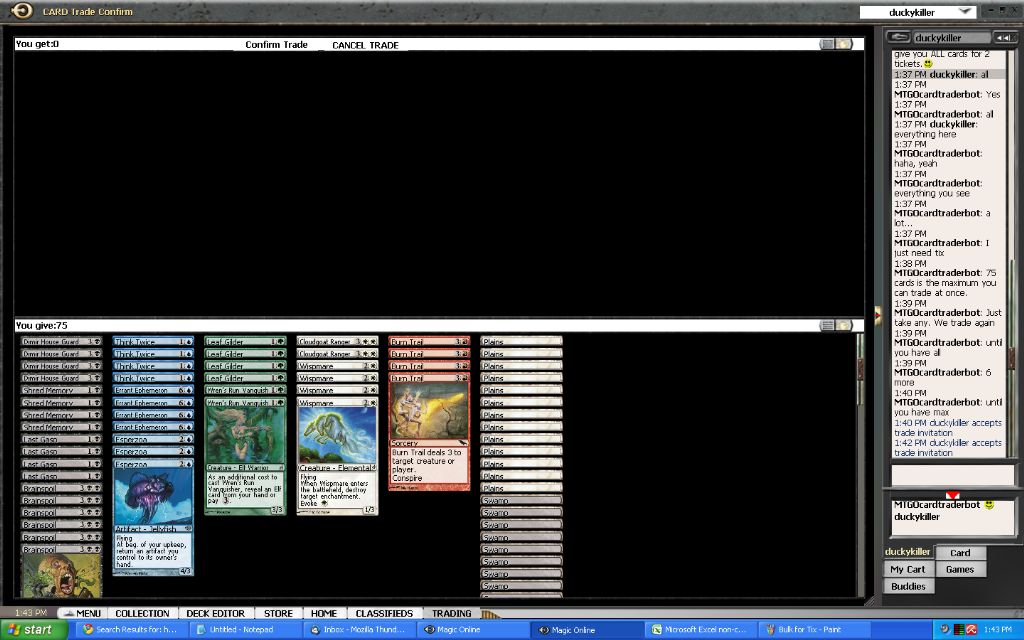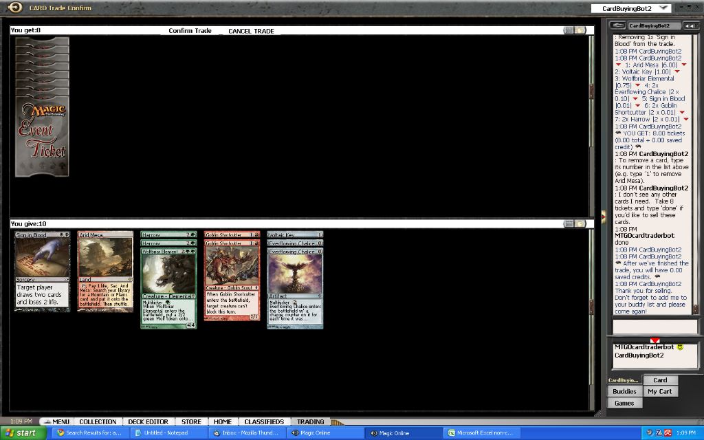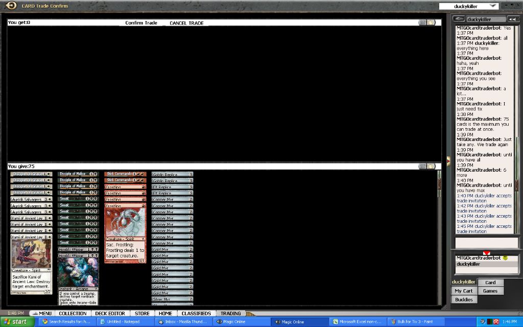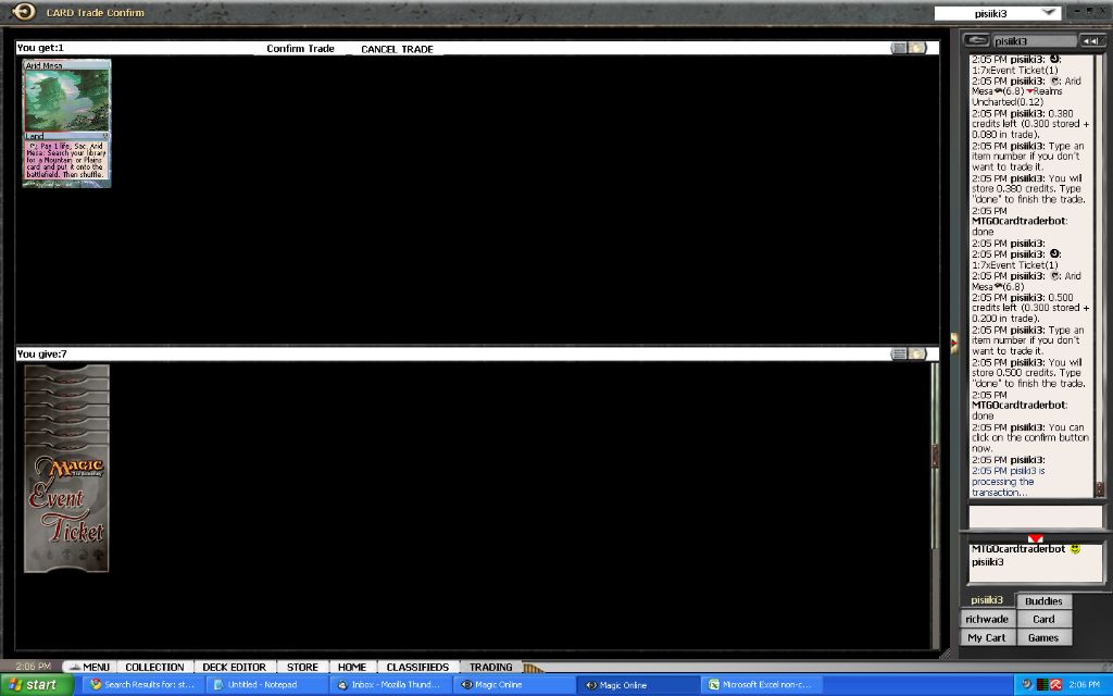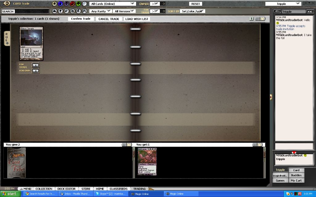 What to do with my event tickets now? Well, I was scanning some bots for possible good deals when I encountered a classified ad that was buying bulk for tickets. This might be just what I was looking for to get rid of all the commons and uncommons I have acquired thus far. After a short conversation I was able to sell nearly all of my commons and uncommons and my cheap rares for 2 event tickets. In my excitement I forgot to make a screenshot of the first trade that contained the tickets… but oh well, here are some of the trade screens anyway: