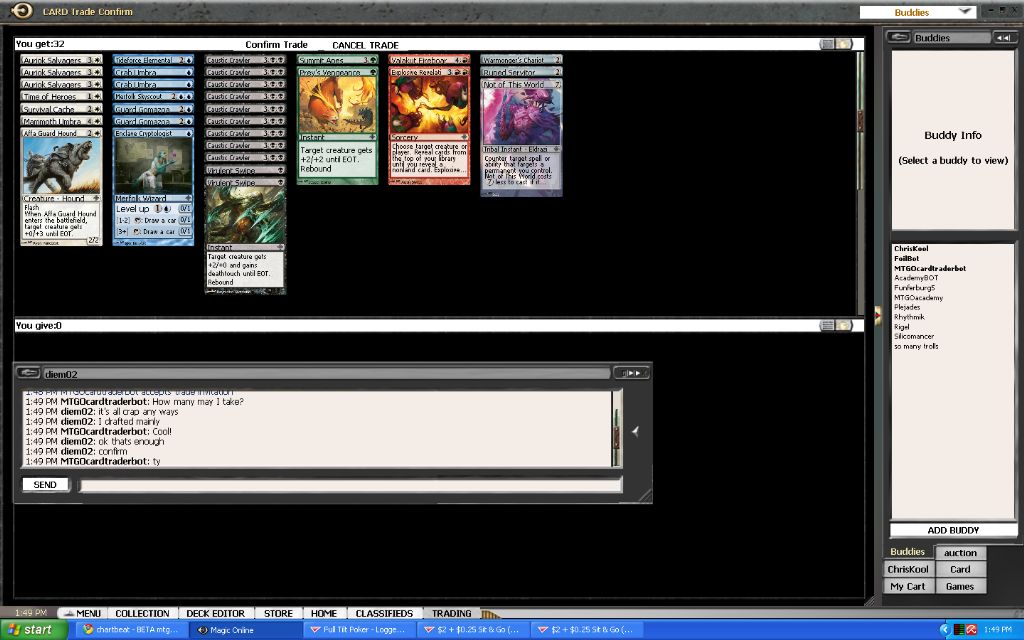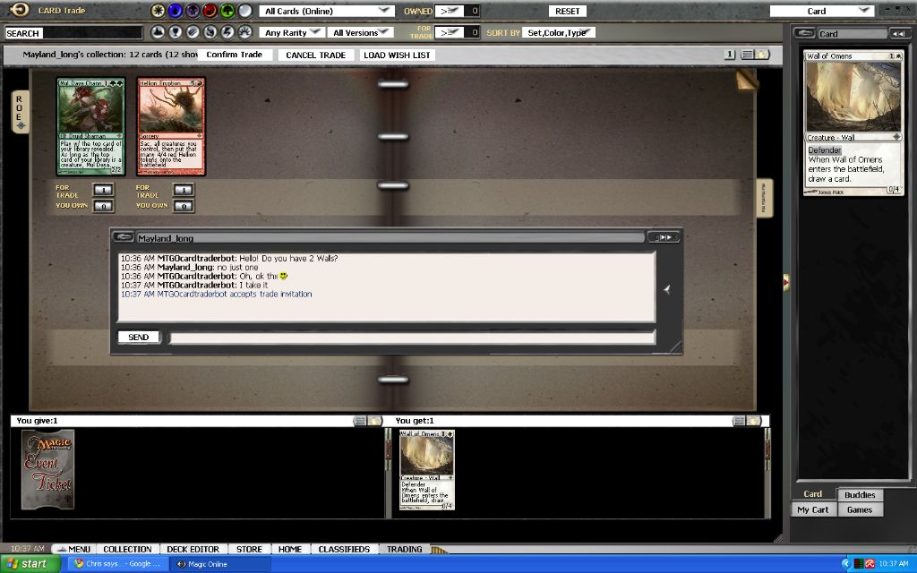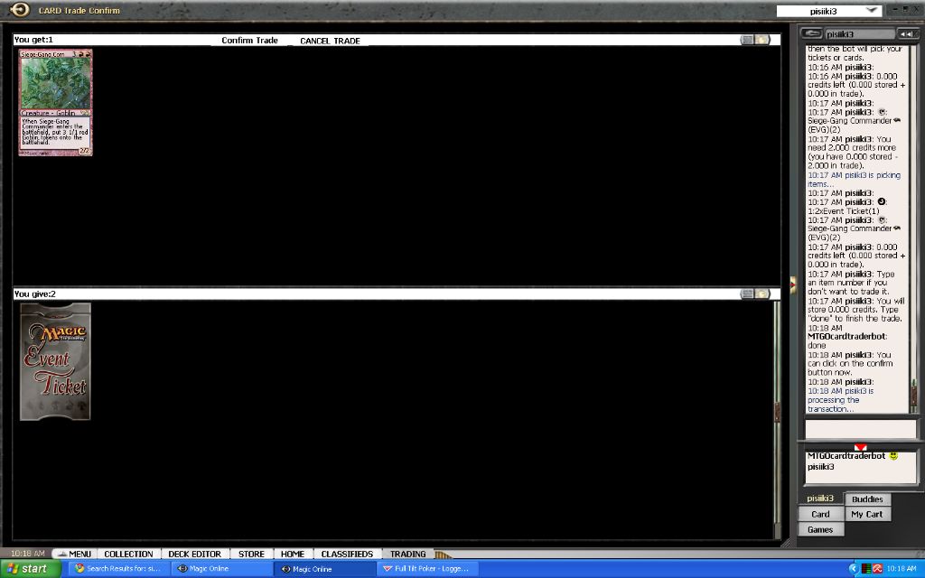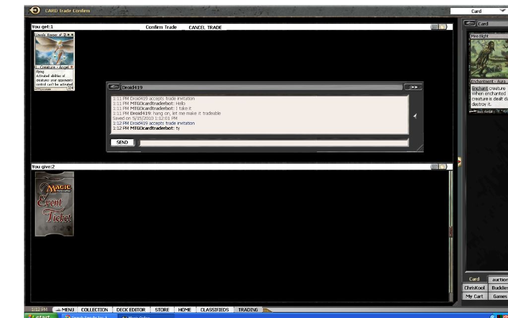 Trading with players is not the only way to increase the value of your collection. Always keep your eyes open to good offers from bots. Yes, you CAN get a good deal from bots sometimes. I scan a few bots and one deal grabs my attention: one selling the “Elves vs. Goblins” version of Siege-Gang Commander for less then the regular versions from the other expansions. That must be a good deal. I buy the foil Commander for 2 Event Tickets and plan to either resell or trade later.