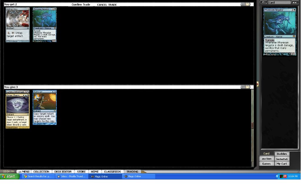 A quick look the next day and I spot an ad that is looking for Twincast! I quickly message him and he is more then happy to trade. What then develops is rather interesting as he doesn’t really care much about card prices and offers a foil Phyrexian Negator and a Voltaic Key for my Twincast and two random cards. The price disparity did not bother him at all and I find myself with a hard to sell but sweet foil card in my trade binder.