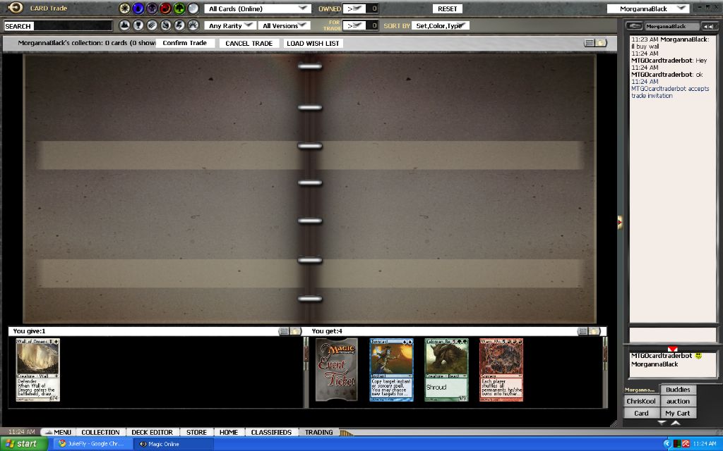 Encouraged with yet another bunch of free commons, I spot a player that is selling Wall of Omens for one Event Ticket. As the card is currently very hot I use a technique that has proven to work many times for me in the past: I buy the card for a good price and flip it immediately for the same price. Only that I ask for a few cheap rares to be added. Most people don’t care much about bulk rares and are happy to add them to get the card they want for a good price. The result can be easily summarized in 2 screenshots: