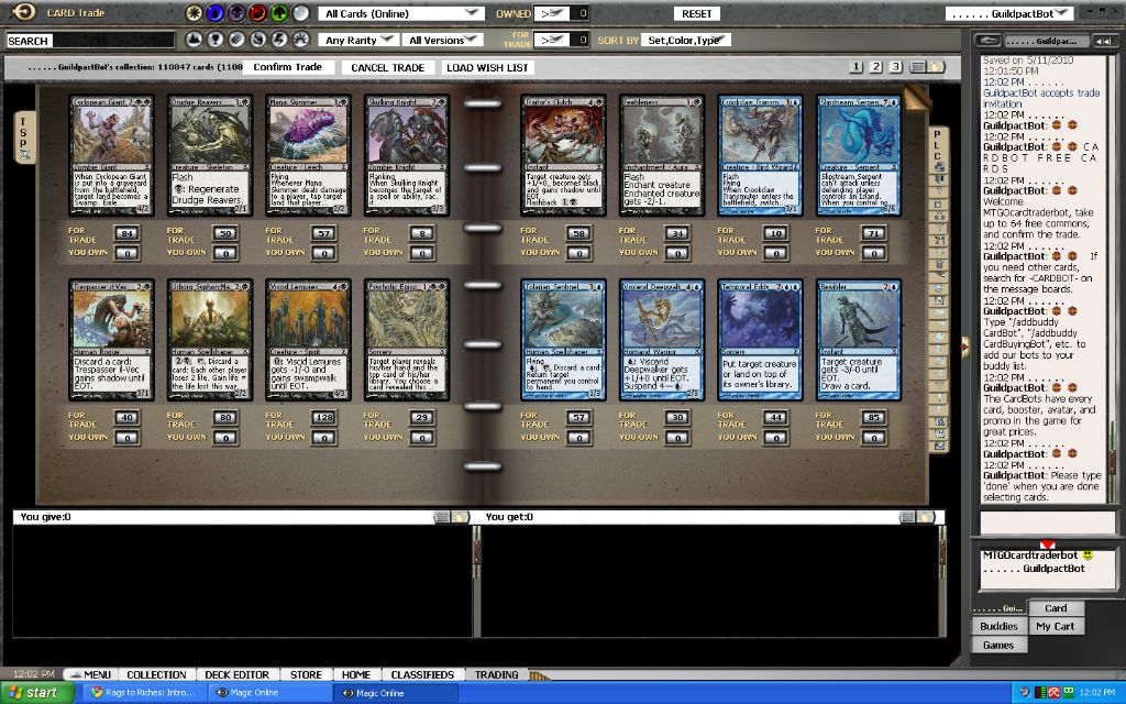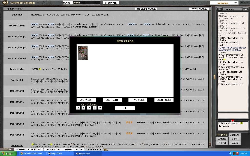 Now the danger you are in when trading for “high value” mythics is always that you get stuck with them for a while and don’t have much trade material. My top priority was to flip the Storm as fast as possible for either tickets or a few popular rares I can use to facilitate more trades. To increase my chances to find a buyer I immediately went to the auction room. You can access the room buy typing:”/join auction” in any chat window. Usually you will find a bunch of regulars there that buy and sell cards, but more often then not it’s just a chat room with folks hanging out. I offered the foil Storm for trade and it took only a few minutes to find an interested player. Unfortunately he did not have much for trade. Fortunately he was willing to buy the card for 3 Event Tickets.