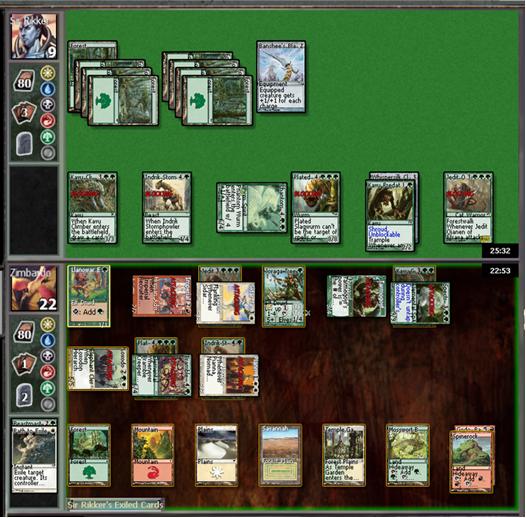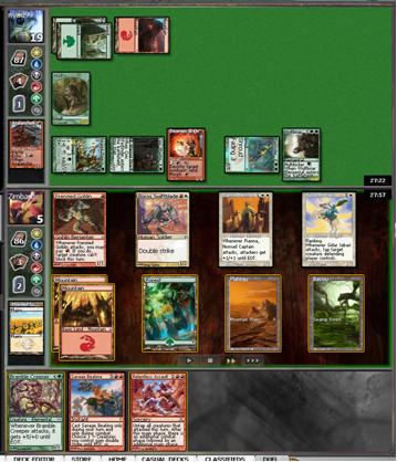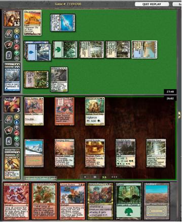 I don’t have screenshots for this deck, because the games aren’t as exciting to show. When it wins, it usually just swarms with aggressive creatures and you win without using an extra combat phase. And it does win more often than the version with the big creatures. Once in a while you get to use Relentless Assault as a finisher, which is pretty fun. On balance, though, this deck doesn’t inspire me as much as my earlier, less competitive version, because it’s too similar to a typical fast Naya deck.