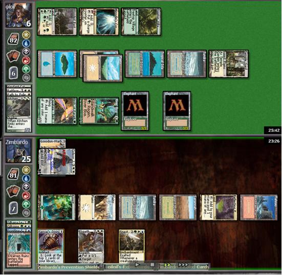 I felt pretty vindicated in the following game after a rough start during which two of my of my lands were blown up and my opponent beat me down to single digits life. I had to let attackers through rather than sacrifice my chance at a lethal dual attack.