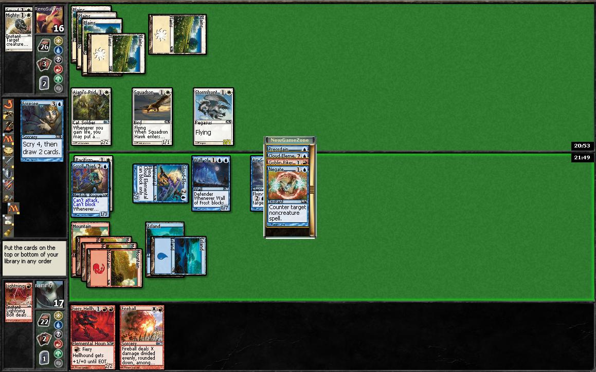 Note: I may have made a mistake in going down to only 12 creatures (with two of them being Cloud Elementals) or a mistake in perhaps not taking a mulligan to get a threat that could deal some real damage. I think it was my own fear of his threats that forced me to water down my deck too much.