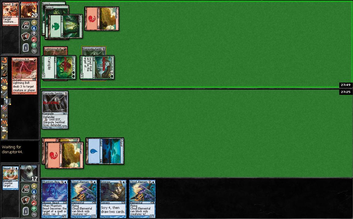G1: Upon reviewing my opponent’s previous match, I saw that he had a red-green aggro deck. A key situation came up when I was stuck on 2 Mountains, 1 Forest (all untapped) and a Gargoyle Sentinel against his 3 Forest, 1 Mountain (all untapped) and Garruks Companion and Sacred Wolf. I opted to not cast a useless Cloud Elemental so that I could have Lightning Bolt and Negate up. When he attacked with both creatures, I chose to block the Sacred Wolf instead of the Garruks Companion. My reasoning was that I wanted to make sure that Sacred Wolf would die this turn. Sorry that I do not have a picture to ask what would happen; however, I do have a picture showing what did happen: