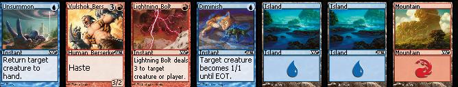 G3: There’s no other way to explain this game than this. I kept an opening hand of 2 Mountains, Island, Goblin Piker, Diminish, Lightning Bolt, and Fiery Hellhound. But as the game progressed, this is what happened:
