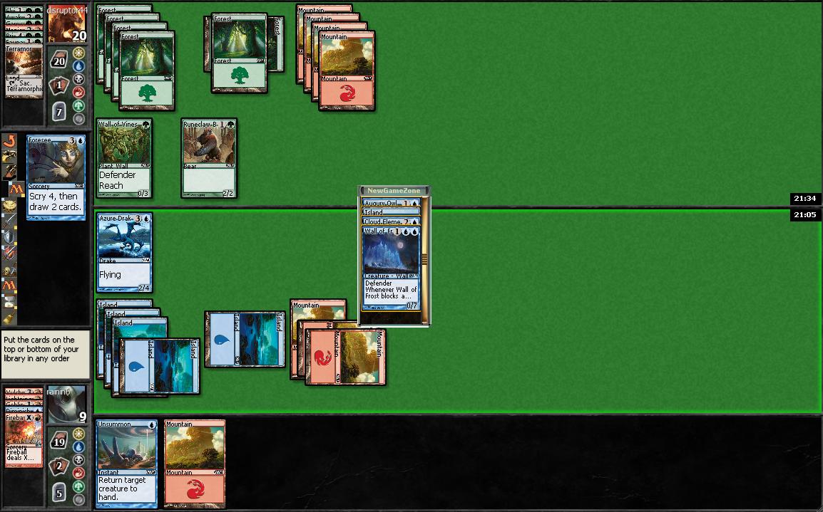 I opted to put Augury Owl and Wall of Frost on top of my library and the rest on the bottom. I kept Augury Owl because the board seemed fairly stalemated and needed to dig for my Ancient Hellkite. The scrying ability on Augury Owl revealed an Island and Gargoyle Sentinel, which I put to the bottom of my library. Eventually, he cast a Yavimaya Wurm. I had my Wall of Frost blocked his Yavimaya Wurm which he used Thunder Strike. I had one card in my hand the Unsummon, but I opted to let my Wall of Frost die because I had Ancient Hellkite in play that I wanted to protect it with Unsummon (while pretending to have a Negate). It did not end up mattering too much, because Ancient Hellkite untapped and dominated the game.