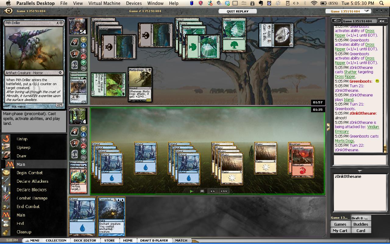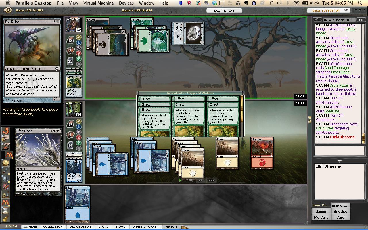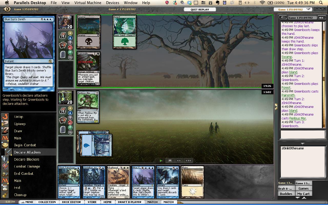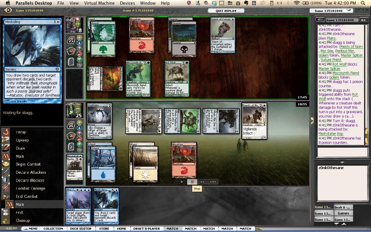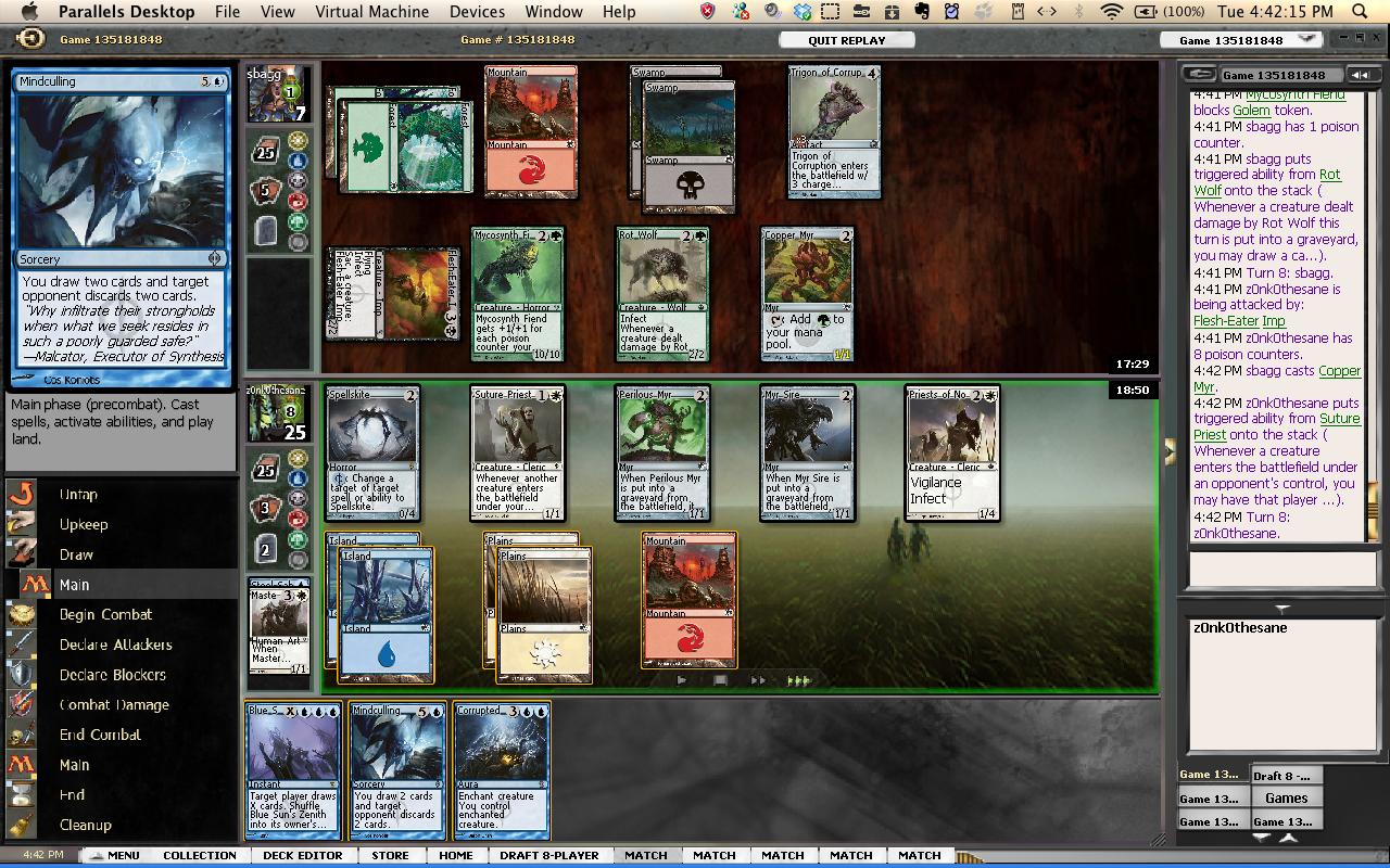 The game progresses and our early aggression stalls on a few sorely-missed lands. After a fairly explosive start, Mindculling into Zenith would have been just about it, but we instead miss drops 5 and 6 and are punished for it.