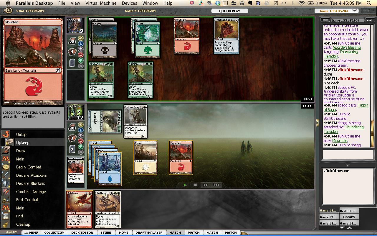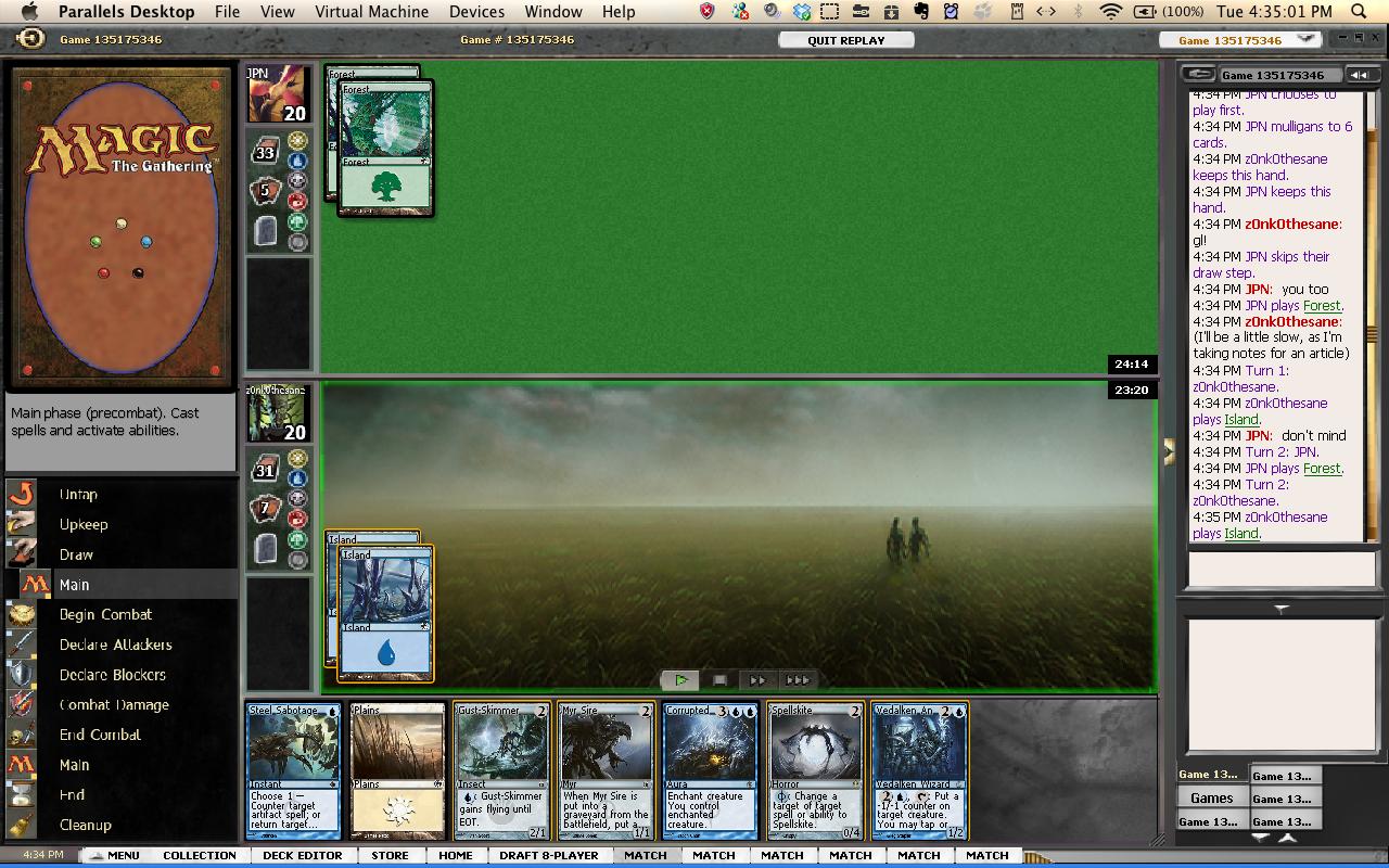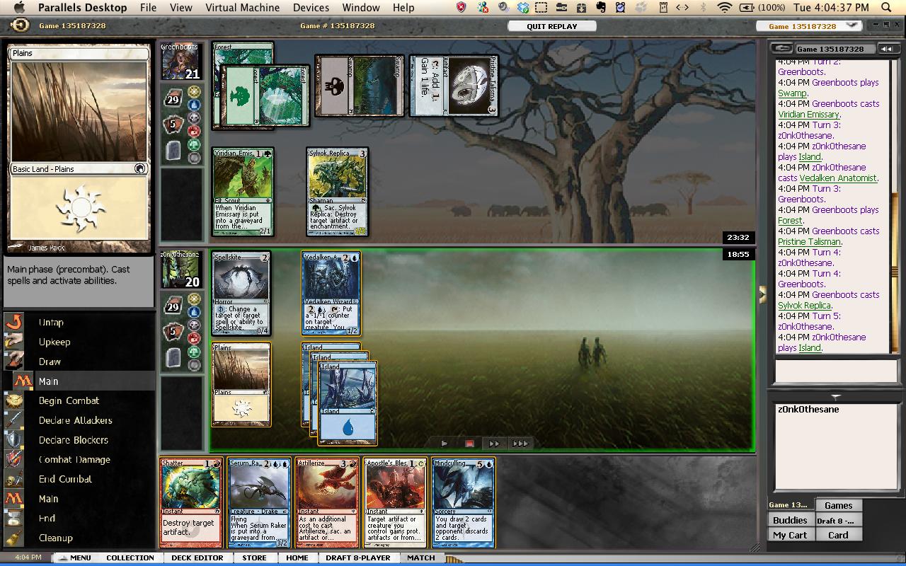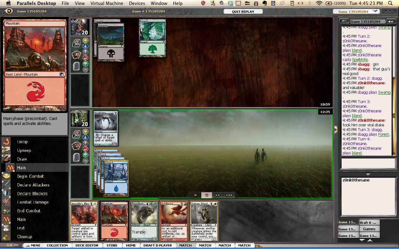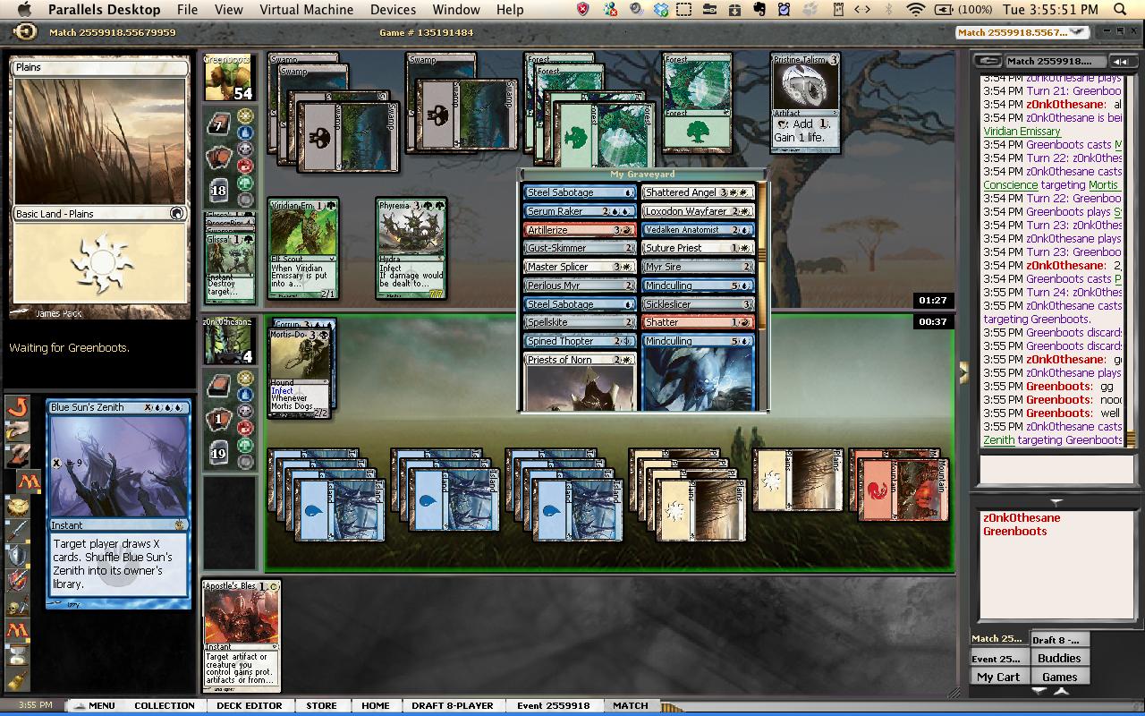 The game progresses and our early aggression stalls on a few sorely-missed lands. After a fairly explosive start, Mindculling into Zenith would have been just about it, but we instead miss drops 5 and 6 and are punished for it.