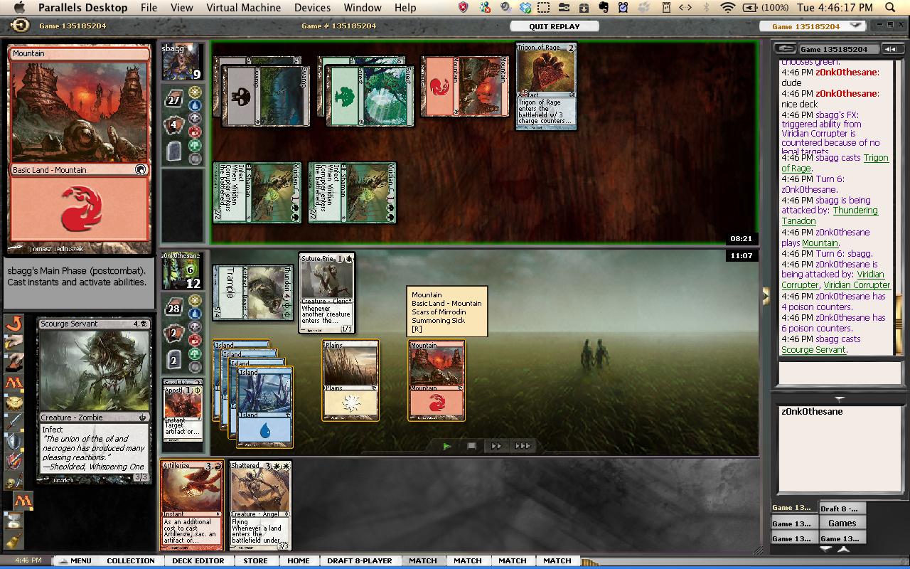 We develop our board a little to try and bait removal before Corrupted Consciousing (which, I imagine, is a bit like dirty guilt-tripping) his Marauder. It takes a few turns to eat through his consistently-drawn blockers and chunky life total, but our ridiculous card advantage gets there.