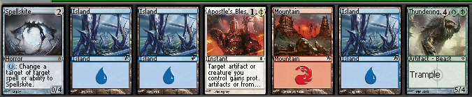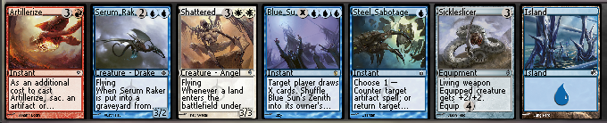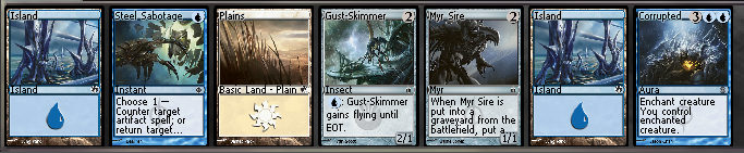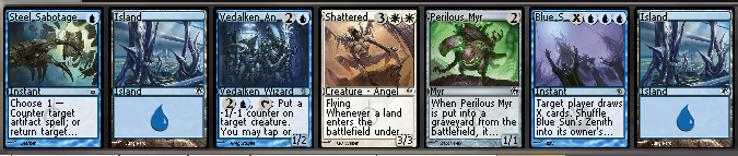 Compare this hand to last game’s. Even though both hands contain cards that won’t get played until much later, this one actually functions on its own two lands. Between Perilous Myr and Steel Sabotage, this seven provides enough early disruption for the Anatomist to come down and immediately control the board. Without the Myr, we might be put in a position where we’d be forced to use all our mana every turn while getting overrun, which is basically the only way to beat Anatomist outside of red, black, and a handful of enchantments. If we survive long enough to hit a seventh land, we’ll ride Blue Sun’s Zenith all the way home.