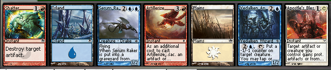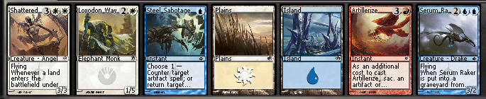 Anyway, back to lands. Since we’ll be drawing better than half the time (most players tend to choose to play in Draft), seventeen lands should be fine, as we’ll have another draw to hit that precious sixth man. Land. I mean land. We’ll need about ten Islands to feel comfortable about being able to cast cards like Zenith and Corrupted Conscious as soon as possible, which leaves us seven to play with. In order to splash our Shatter and Artillerize, we’ll probably want to have two Mountains, as both cards are fine for the late game. Five Plains simply won’t be enough to reliably cast Kembas Skyguard anywhere near Turn 3, but I don’t think the flyer is really needed. I never liked him, anyway.